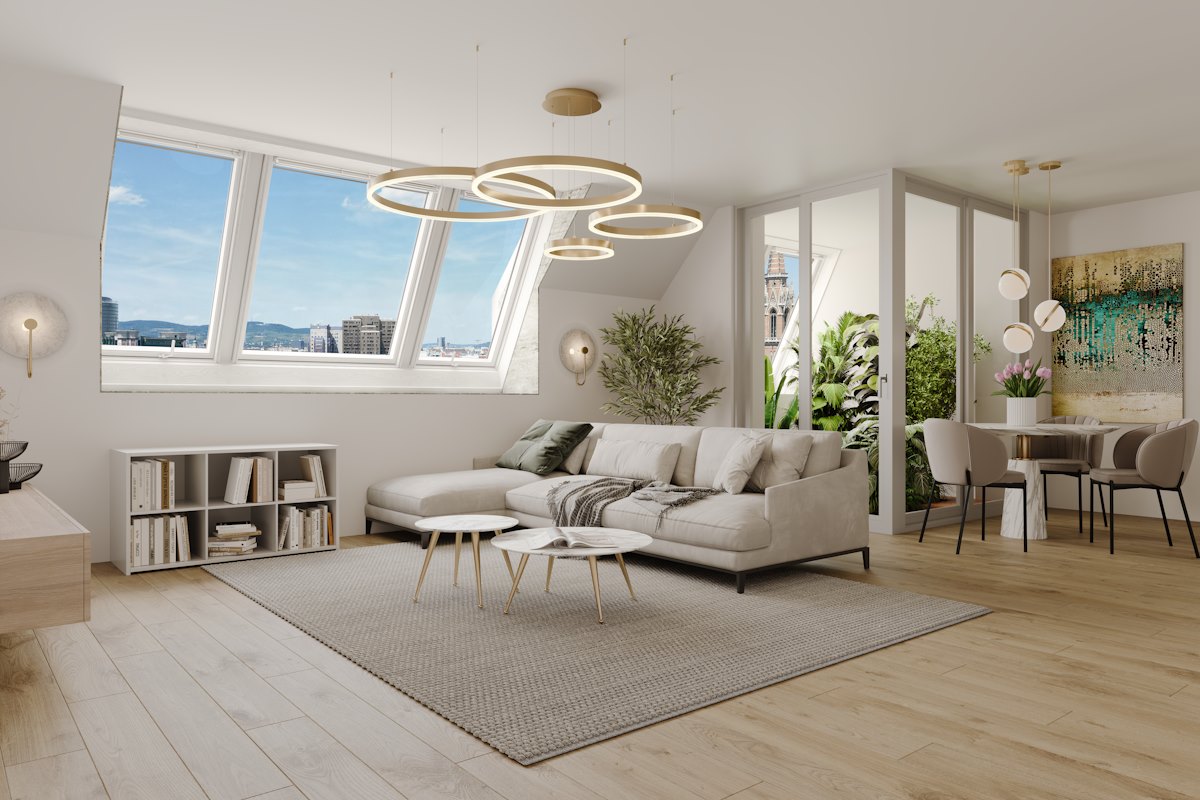 Wo Träume wahr werden: Von der Dachterrasse bietet sich ein wundervoller Fernblick bis zum Stephansdom. Die weitläufig angelegten Wohneinheiten erstrecken sich über mehrere Ebenen und sind unter anderem über schwebende Treppen erreichbar. Die großen Dachflächenfenster mit Außenrollos sowie Klimaanlagen sorgen für ein angenehmes Raumgefühl.